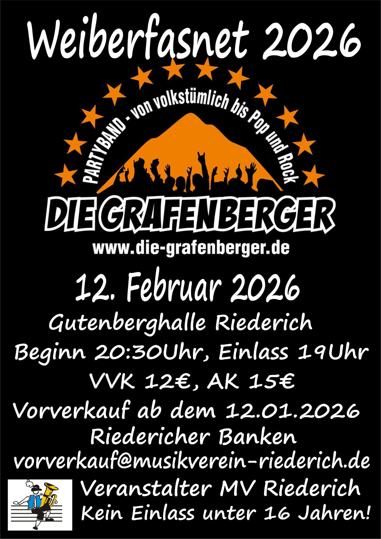 Die Grafenberger heizen die Gutenberghalle in Riederich am 12. Februar 2026 richtig ein. Heiße Kostüme, hammer Musik und jede Menge Party! Sichert euch ab 12. Januar 2026 Karten im VVK (12 €) über vorverkauf@musikverein-riederich.de oder bei den Riedericher Banken.